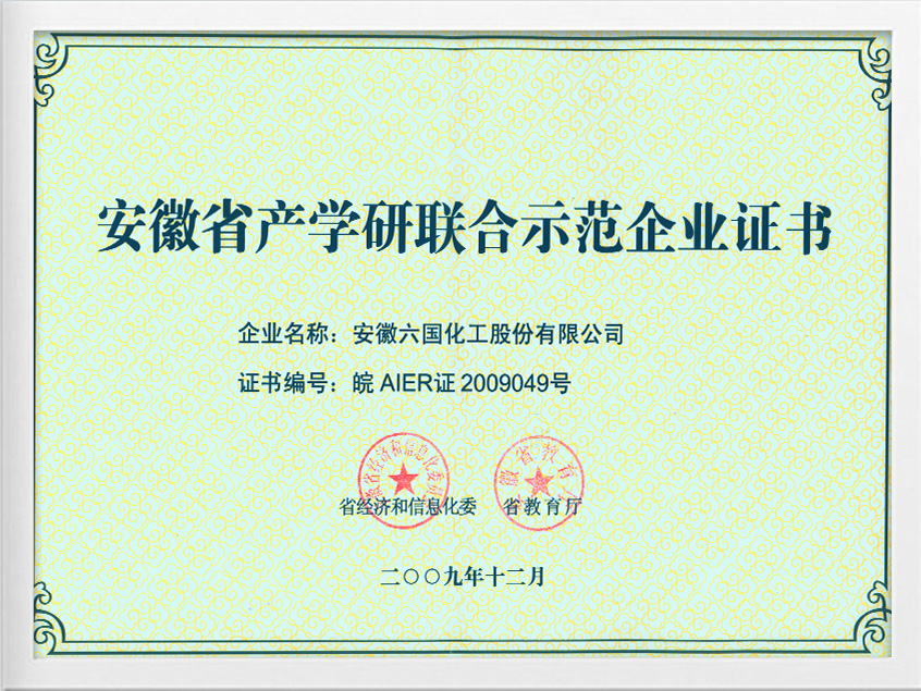 安徽省产学研联合示范企业证书