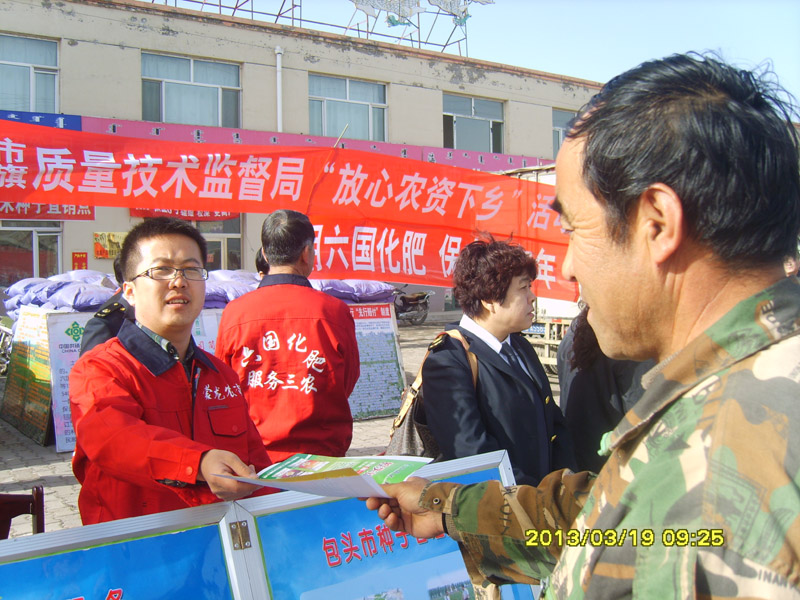 近日,内蒙土右旗工商局2013年服务“三农”红盾护农宣传维权暨放心农资下乡现场会在土右旗双龙镇召开,内蒙古电台经济生活广播《天天3·15》进行了现场直播。英国威廉希尔公司官网农化服务人员在活动现场向前来参会的农牧民发放了上千份的农化服务手册和辨别真假肥料“明白纸”。英国威廉希尔公司官网土右旗直销点联销商、土右旗农资协会会长倪志亮现场带头交纳了5万元的“农资先行赔付抵押金”,并就“农资先行赔付制度”从制度上杜绝经营户经销假冒伪劣农资的做法接受了《天天3·15》栏目的现场专访。
